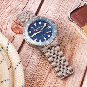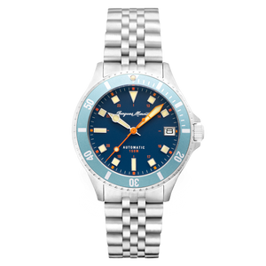 A fun, original timepiece that looks back at the flair, style, and character of traditional skin-diver watches, while injecting them with a twist and a resolute foundation of quality and workmanship. Durable, enduring, and dipped in a tropical diver watch style that's a celebration and echo of the waters of the Caribbean.