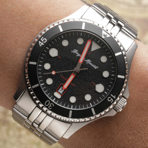This robust diver is dipped in the colours of a neo-vintage Gallic holiday. Built with intent and dedication, this is a watch with subtle echoes of colour, charm and character throughout the timepiece.
